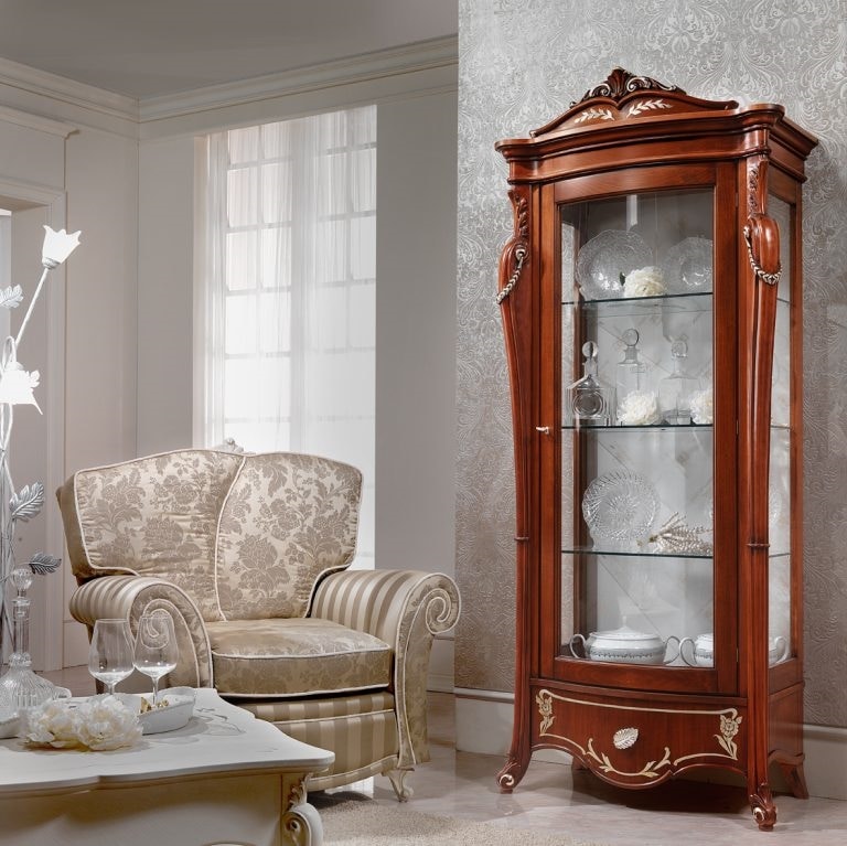 Vitrine de style classique à 1 porte, avec structure en bois, avec décorations faites à la main. Étagères internes en verre.