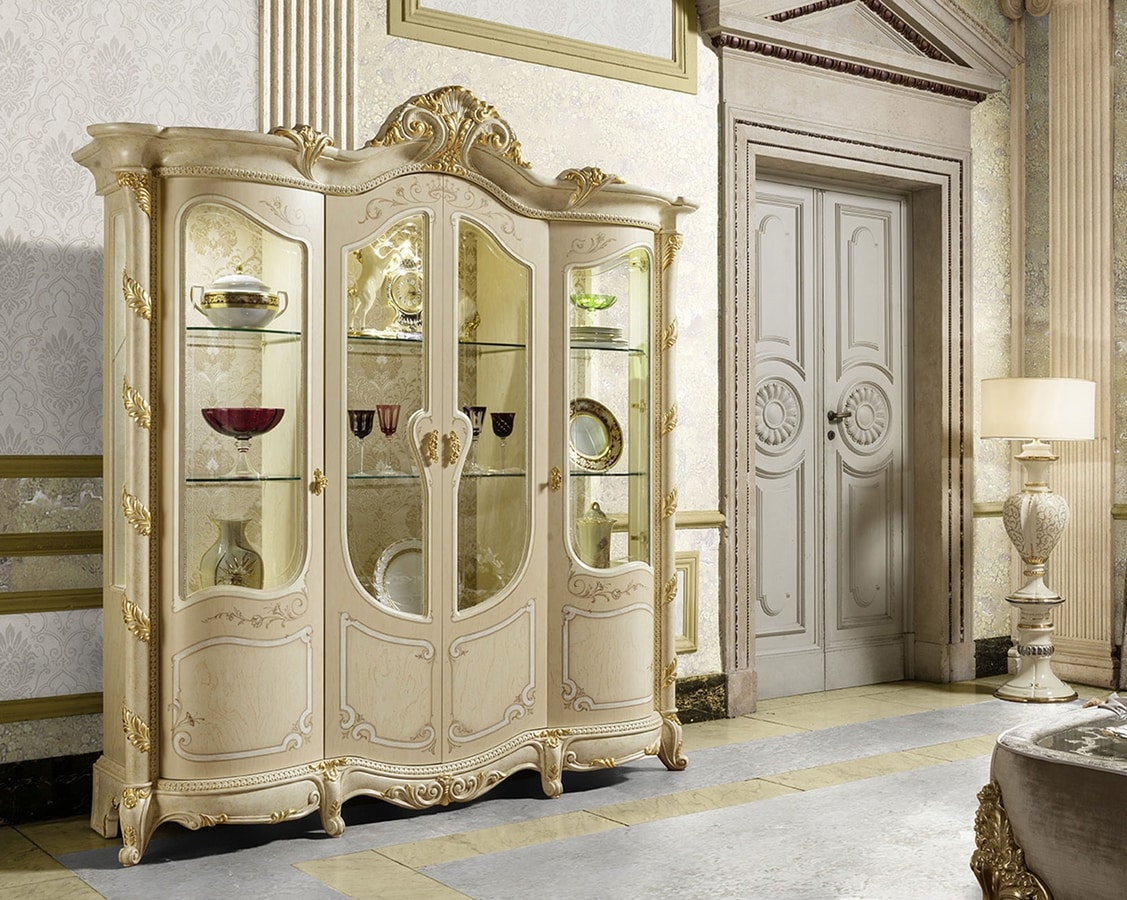 Vitrine à 4 portes, avec dossier rembourré en tissu.