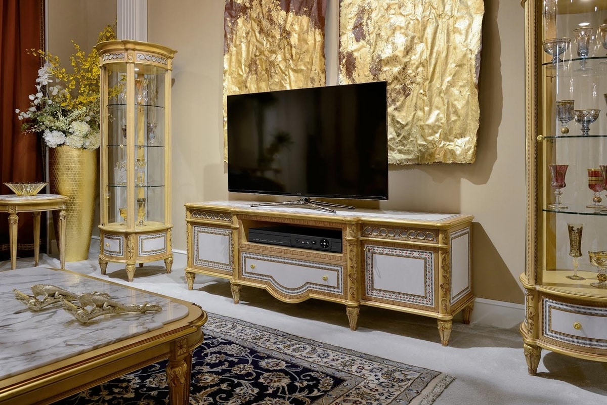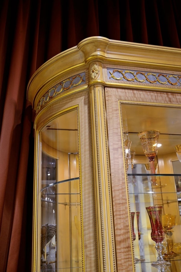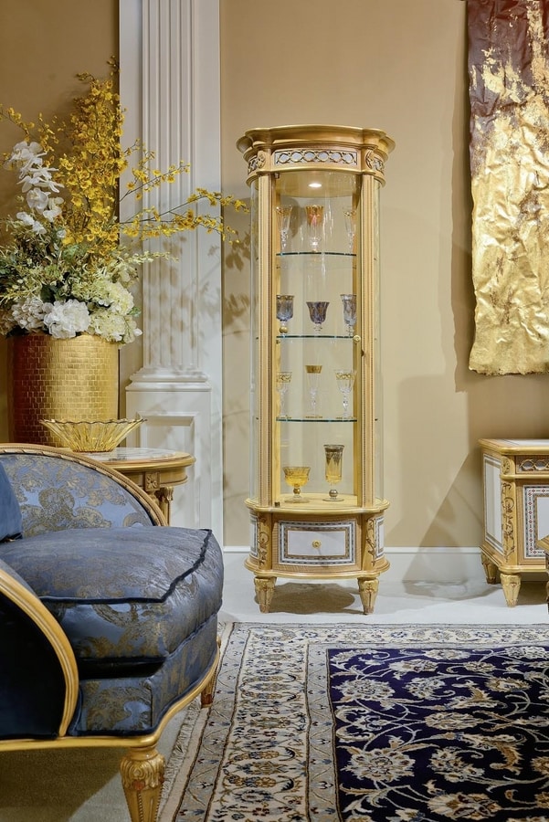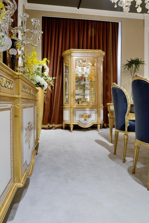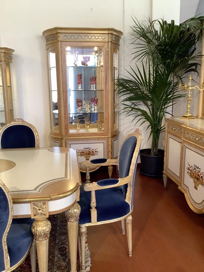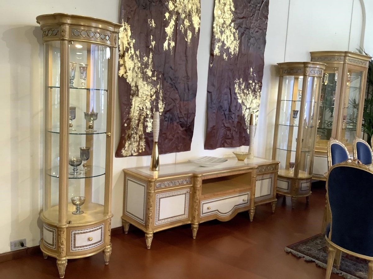 Demander prix Produits similairesVitrines classiques de style Louis XVI. Lumineux et élégants, ils fournissent le salon et la salle à manger combinés au meuble télé, à la table et au meuble. Plein de détails sculptés dans une finition décapée aux couleurs or et bronze. Les dalles à la lumière, encadrées de motifs géométriques typiques de cette collection, sont également proposées dans la partie inférieure des armoires. Pour le meuble en verre à 2 portes, nous trouvons les incrustations florales colorées utilisées pour la chambre à coucher. Cette collection a été conçue pour l’ameublement à 360 °. Nous retrouvons le même style pour la chambre à coucher, la salle à manger et le salon. Sur demande aussi pour la cuisine!