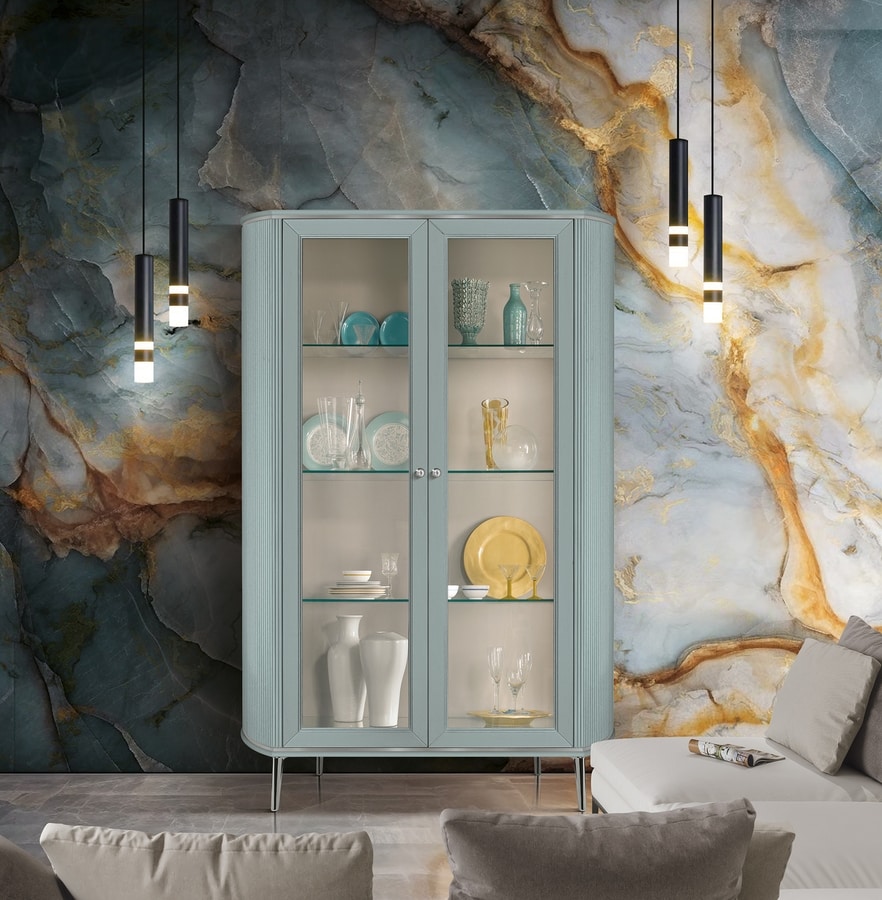 Vitrine 2 portes à fermeture amortie, décoration nervurée. Finition laquée.