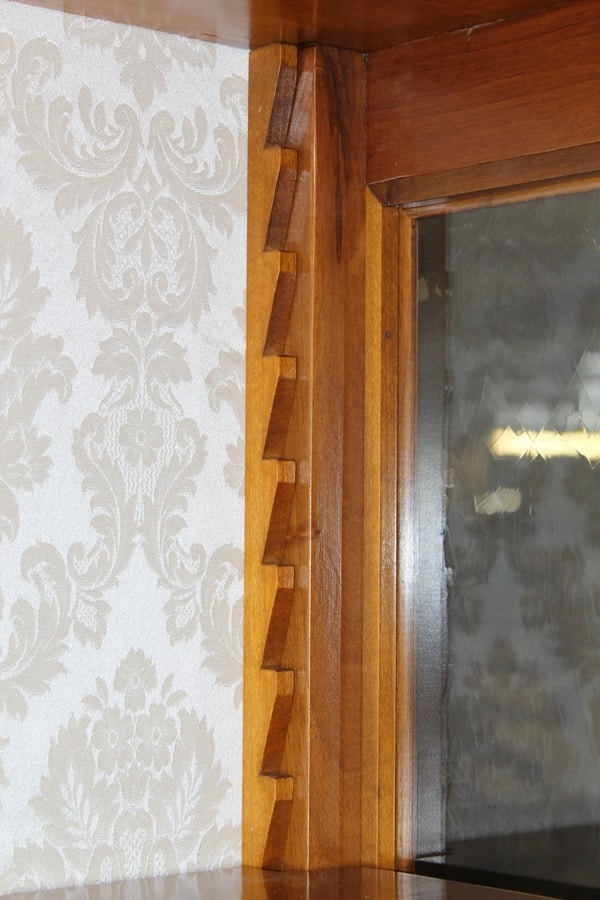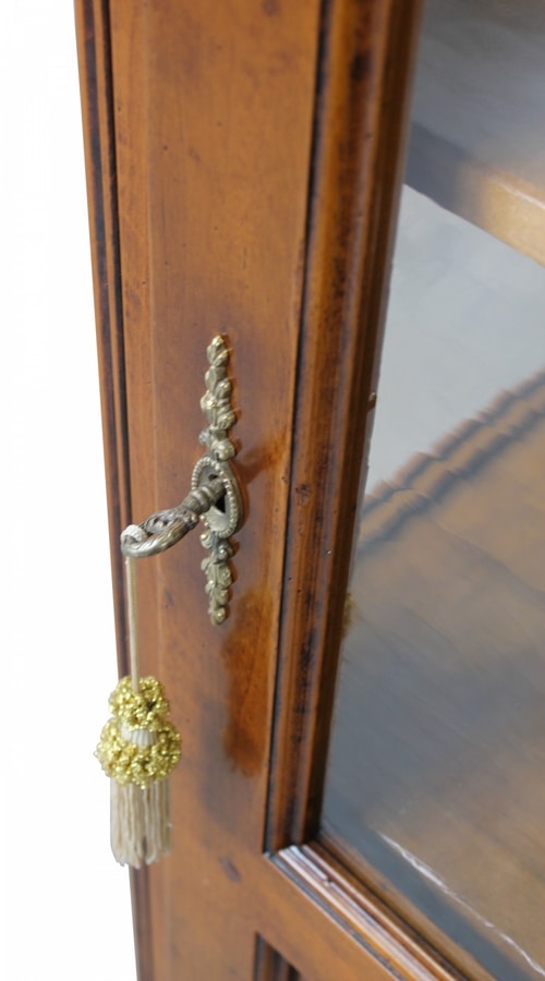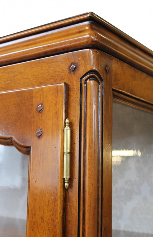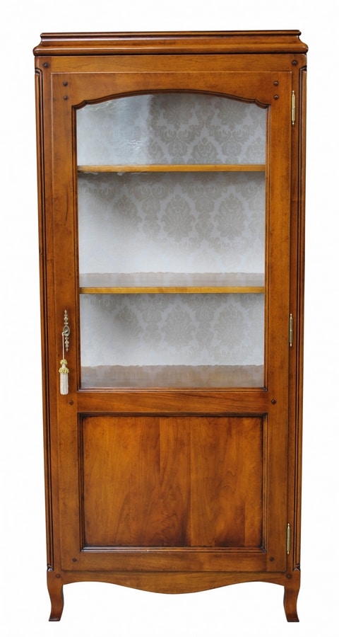 Vitrine en noyer de Provence avec une porte. Structure linéaire avec plateau façonné, bandes de pilastres sculptées, tablier ondulé et pieds façonnés. Dos doublé tissu et trois étagères repositionnables grâce aux encoches en bois du fond.