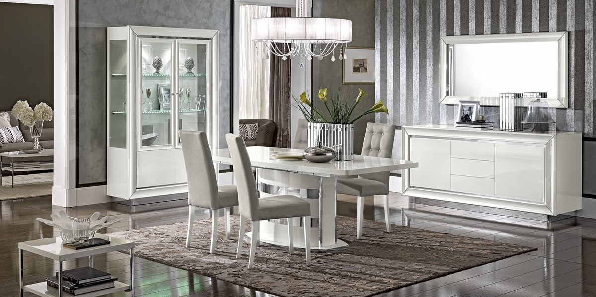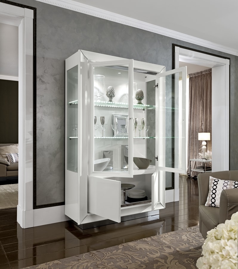 Vitrine avec lumières LED sur les étagères en verre internes. Mélange de lignes géométriques et d'éléments courbes. Compromis élégant entre forme et fonctionnalité. Design avec une touche typique "Made in Italy".