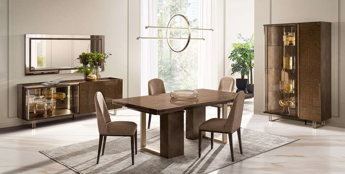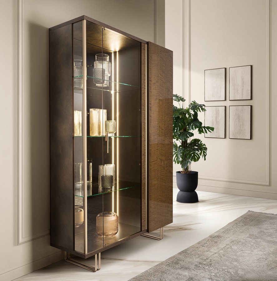 Les panneaux latéraux en bronze mat et les profils en or satiné de couleur champagne introduisent un contraste raffiné, soulignant les volumes et ajoutant une touche précieuse qui élève la sophistication globale de la collection.