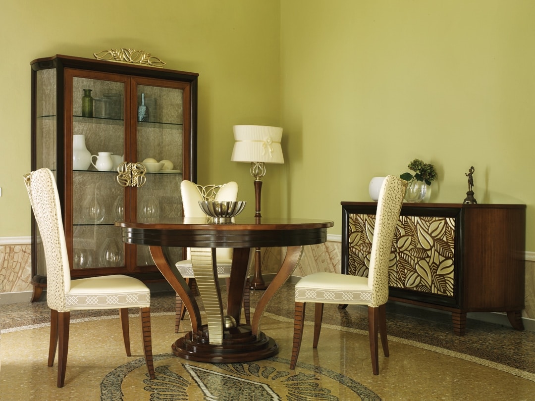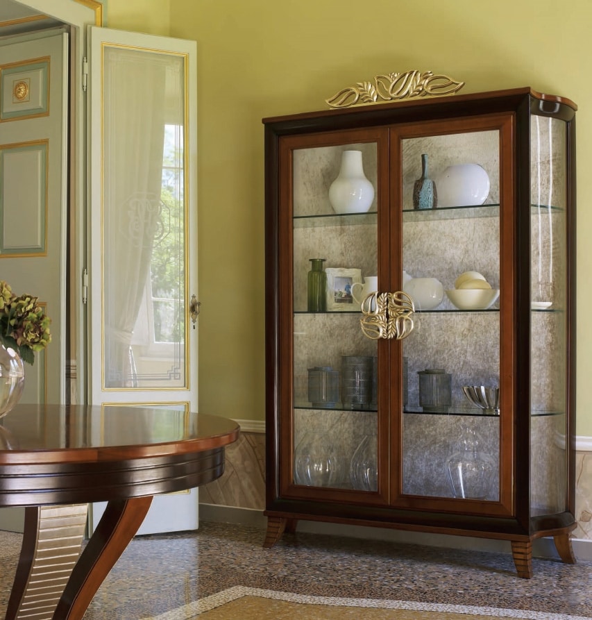 La collection Etoile s'inspire des meubles néoclassiques et Biedermeier, à la décoration saisissante mais sobre et influencée par l'architecture de l'époque. Chaque meuble propose de nombreuses solutions fonctionnelles, en parfaite harmonie avec les décors or et argent, appliqués à la main selon des techniques italiennes ancestrales. Fort contraste de couleurs entre les différentes parties de chaque article et de nombreux types disponibles. Les bois précieux et les grains exposés donnent un fort contraste avec les sections décorées.