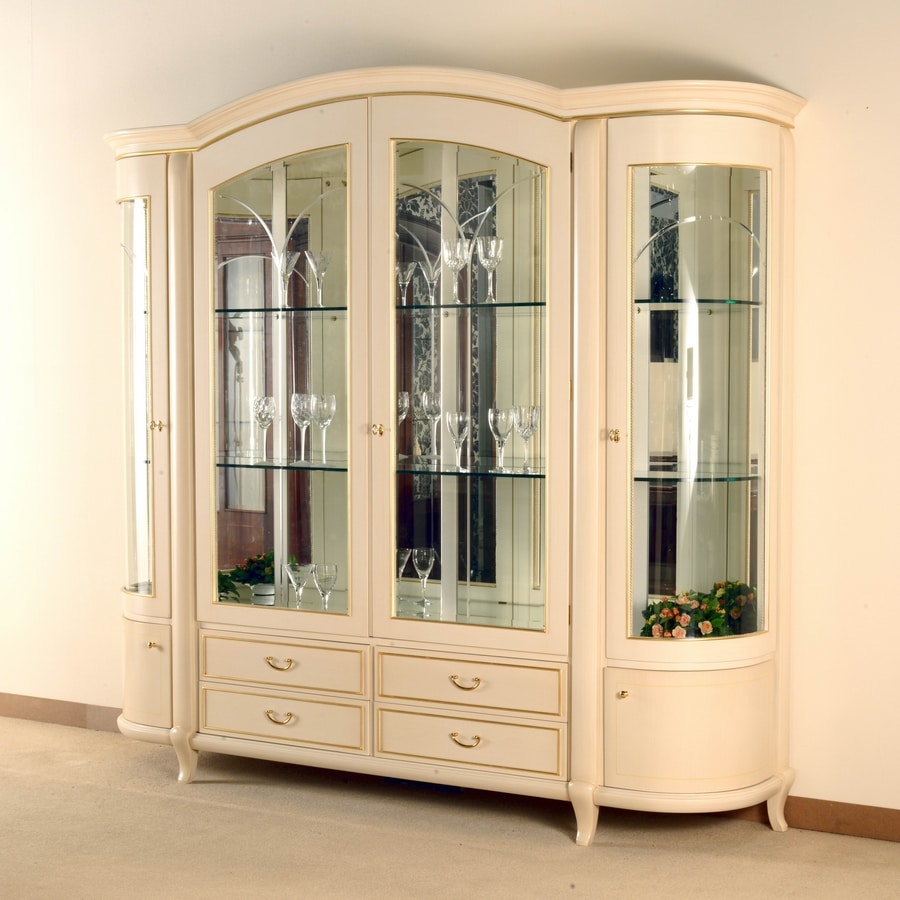 Vitrine avec 4 portes et 4 tiroirs. Cristaux biseautés et gravés. Structure en bois avec finition laquée ivoire patinée, décorations faites à la main.