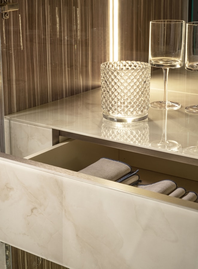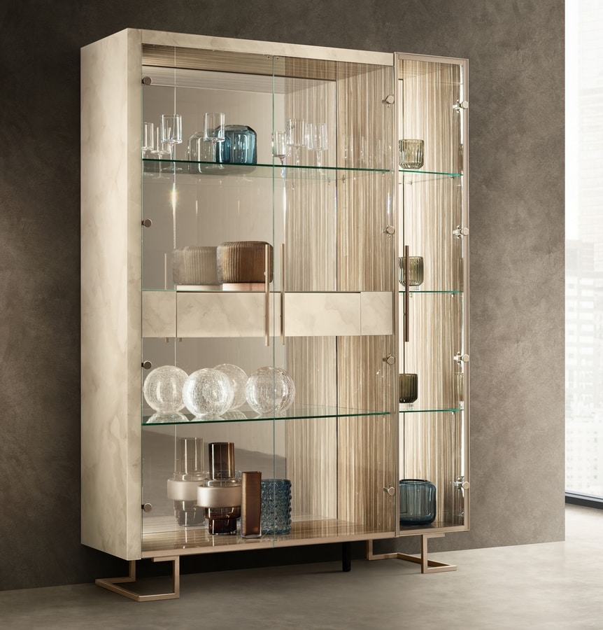 Demander prix Produits similairesVitrine 3 portes avec tiroir central. Élégance, effets de lumière et conception modulaire pour la vitrine de l'espace de vie, qui peut être "construite" selon les exigences du client en insérant un module supplémentaire à une porte à droite et/ou à gauche de l'élément central à deux portes. Un autre élément pour moduler et personnaliser la disposition de la vitrine est le tiroir, qui peut être intégré au module central à deux portes pour augmenter sa polyvalence et sa capacité. L'intérieur est tapissé de velours, tandis que l'extérieur reprend l'effet Light Onyx du plateau et des côtés.
