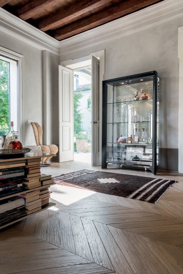 Vitrine pour le salon. Structure en bois laqué, cadre en métal chromé; volets, côtés et étagères en verre trempé, profilés en aluminium anodisé.