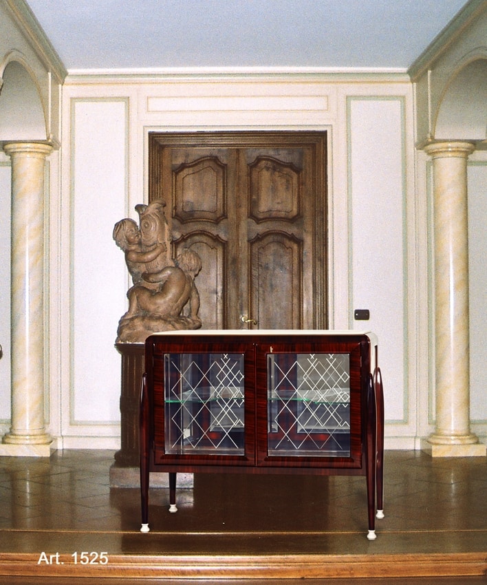 Vitrine en palissandre et bois d'érable à 2 portes. Cristaux biseautés et gravés, polissage "brillant".