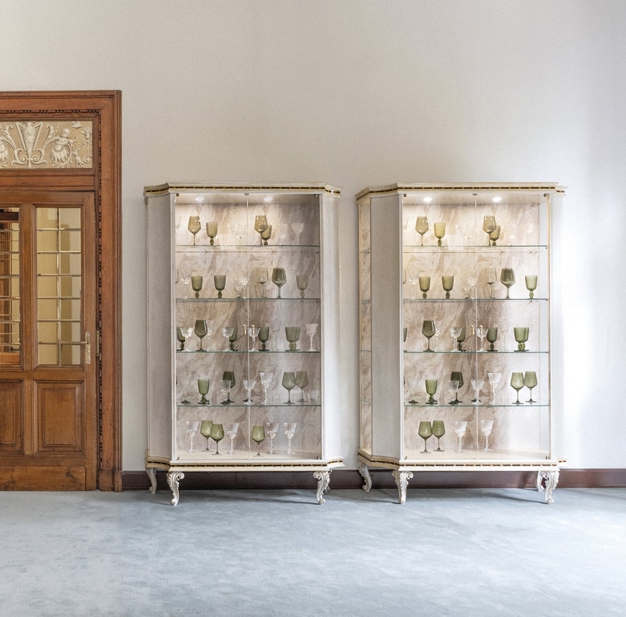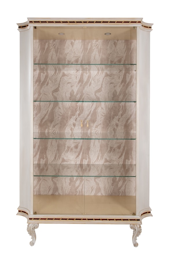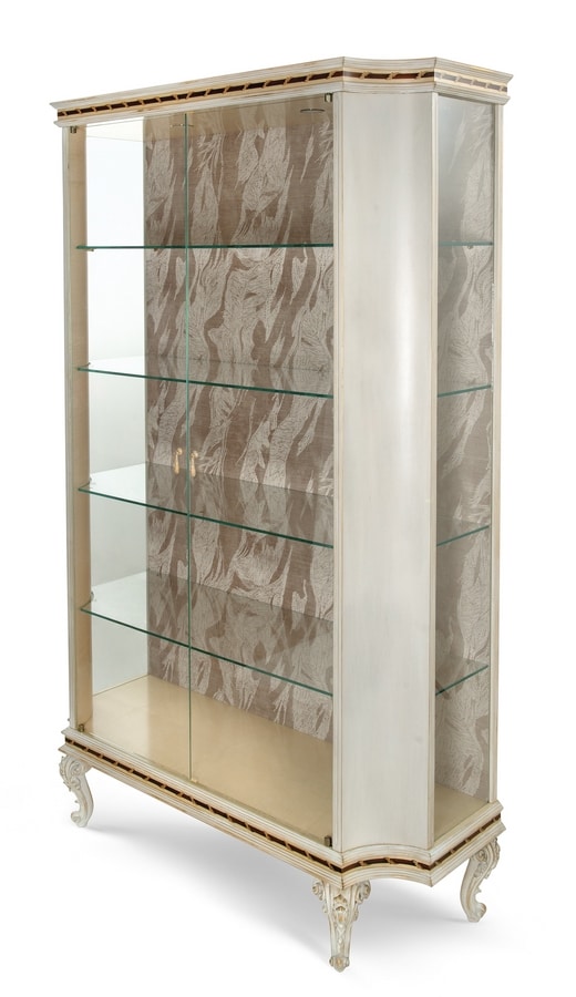 Élégant vitrine avec 2 portes en verre et une structure laquée dans une température française de meringue blanche sur la feuille d'or, après la finition LAFM. Les jambes finement sculptées soutiennent une composition harmonieuse enrichie d'inclays raffinés sur un fond erable, améliorés par un corrige décoratif en bois de rose et en poirie ombragée. À l'intérieur, 4 étagères en verre complètent l'intérieur.
